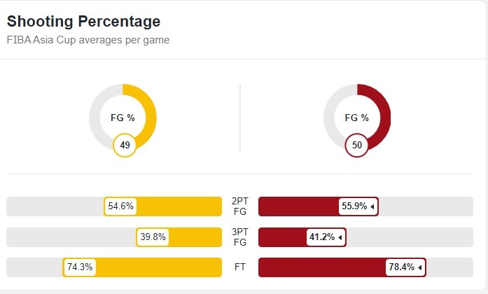 亚洲杯开打至今,中国男篮和澳大利亚男篮的表现都非常出色。数据层面,中国男篮的投篮命中率略占优势,投篮命中率50%对49%,两分命中率55.9%对54.6%,三分命中率41.2%对39.8%,罚球命中率78.4%对74.3%。