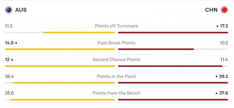利用对手失误得分中国男篮占优,17.2对11.2。场均快攻得分澳大利亚更多,14.8对10.2。场均二次进攻得分两队接近,澳大利亚12,中国男篮11.4。禁区得分中国男篮占优,39.2对36.4。替补得分也是中国男篮更多,37.6对35.6。